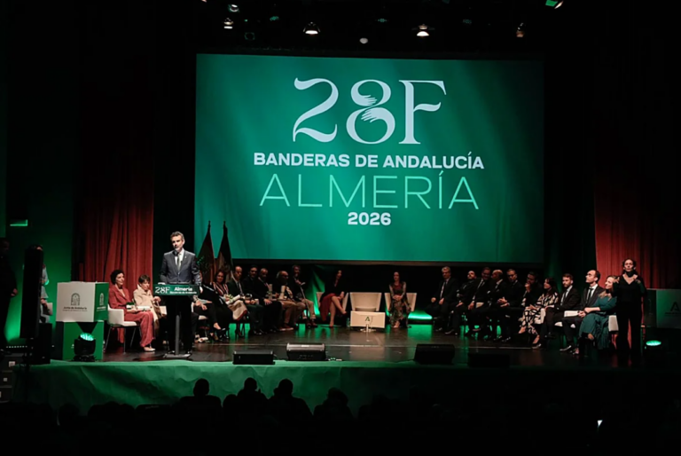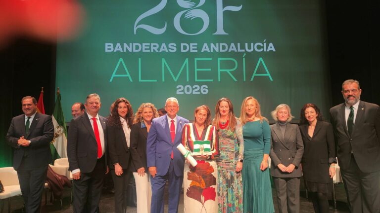 La entrega de las Banderas de Andalucía 2026 se celebró el 28 de febrero en el Conservatorio Profesional de Danza Kina Jiménez de Almería, presidida por el consejero de Agricultura, Pesca, Agua y Desarrollo Rural, Ramón Fernández-Pacheco, y con la presencia de la delegada del Gobierno andaluz en la provincia, Aránzazu Martín; la alcaldesa de Almería, María del Mar Vázquez; el presidente de la Diputación de Almería, José Antonio García; y otras autoridades provinciales y autonómicas.